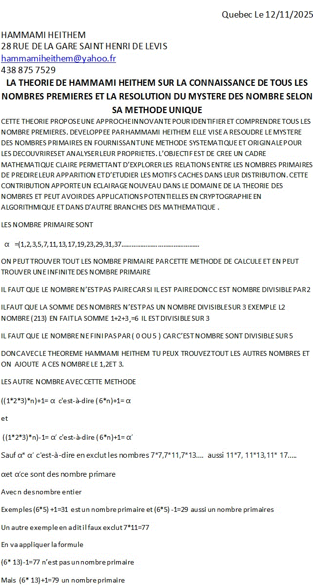 Ce qui m'a amené à faire ce que je fais aujourd'hui dans le domaine des mathématiques, c'est l'infini des nombres premiers. Cette exploration sans fin est le cœur de mon travail chez Mathématique Heithem Hammami. Découvrez l'unique argument de vente de notre site : les formules de calculs.